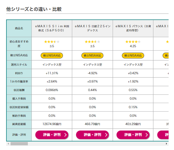 つみたてNISA対象投資信託について、商品の基本情報に加え、さらに詳細な専門家の評価コメント、買い方、売り方の手順、5大ネット証券で購入する場合の比較やつみたてNISAでの購入可否、クレカ積立でのポイント還元の情報などをわかりやすく紹介しており、初心者でも商品選びから購入までを具体的にイメージすることができます。