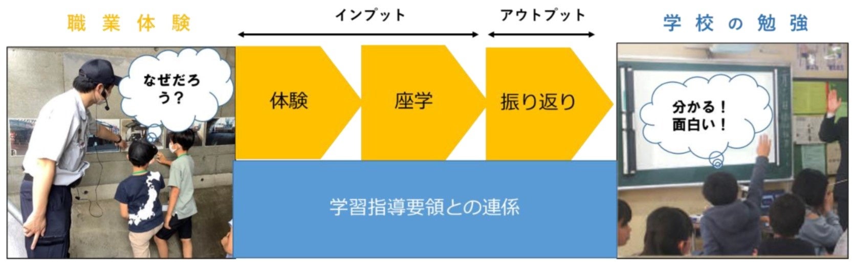 本商品では体験の学習効果を最大化させるため、従来の職業体験だけではなく、最新の学習指導要領と連係した座学や振り返りを加えた体験学習を提供します。「体験」では、お子さまにとって非日常的な仕事の現場の体験を通じて知的好奇心を喚起し、「座学」では、楽しい解説やクイズなどを通じ、学校の勉強と社会とのつながりを伝えます。最後の「振り返り」では、その日に学んだことをアウトプットすることでより確かなものとし、その後の勉強への意欲を高めます。