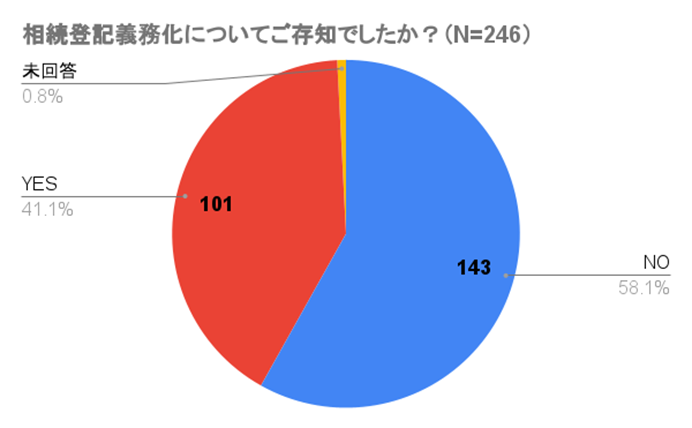 相続登記義務化に際し、ベストファームグループが顧客246名に対して行った独自の認知度調査では、「相続登記義務化についてご存知でしたか?」という設問に対し、Yesと答えた回答者が41.1%、Noが58.1%でした。