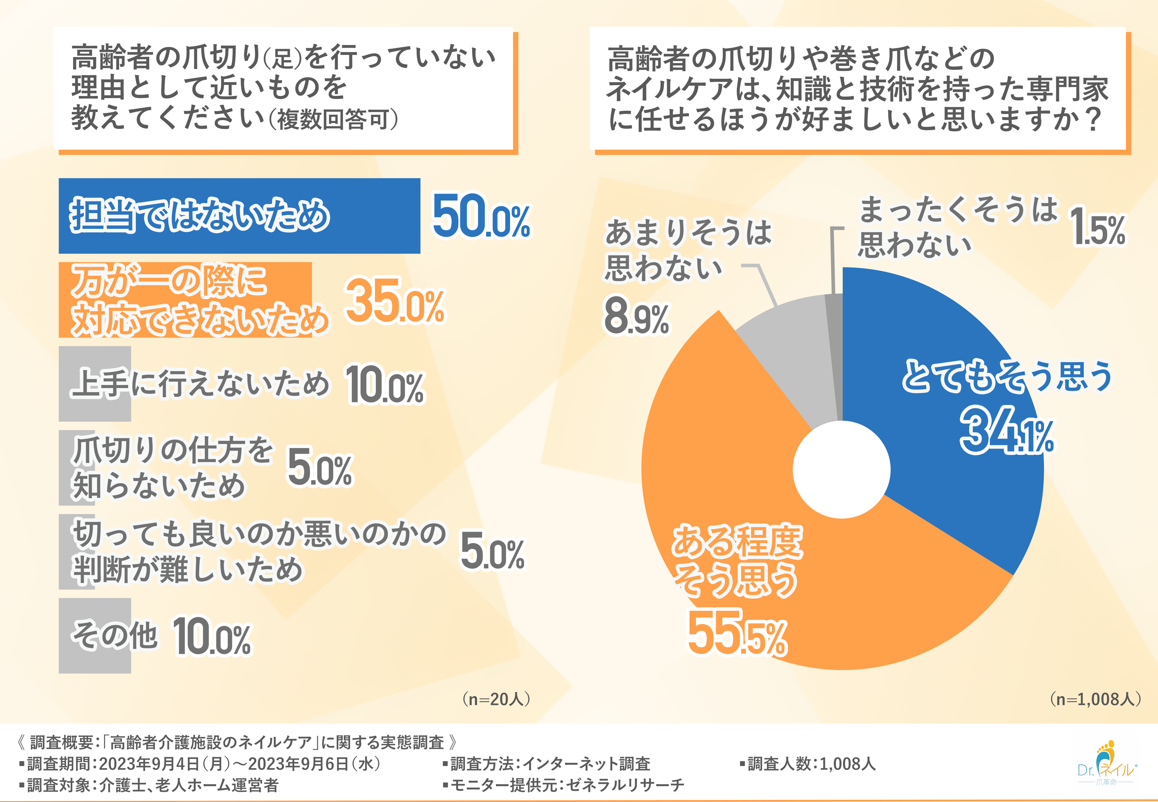 そこで今回、フットケア専門店『ドクターネイル爪革命®』を運営を行う在宅医療マッサージ株式会社(https://dr-nail.jp/)は、介護士と老人ホーム運営者を対象に、「高齢者介護施設のネイルケア」に関する実態調査を実施しました。