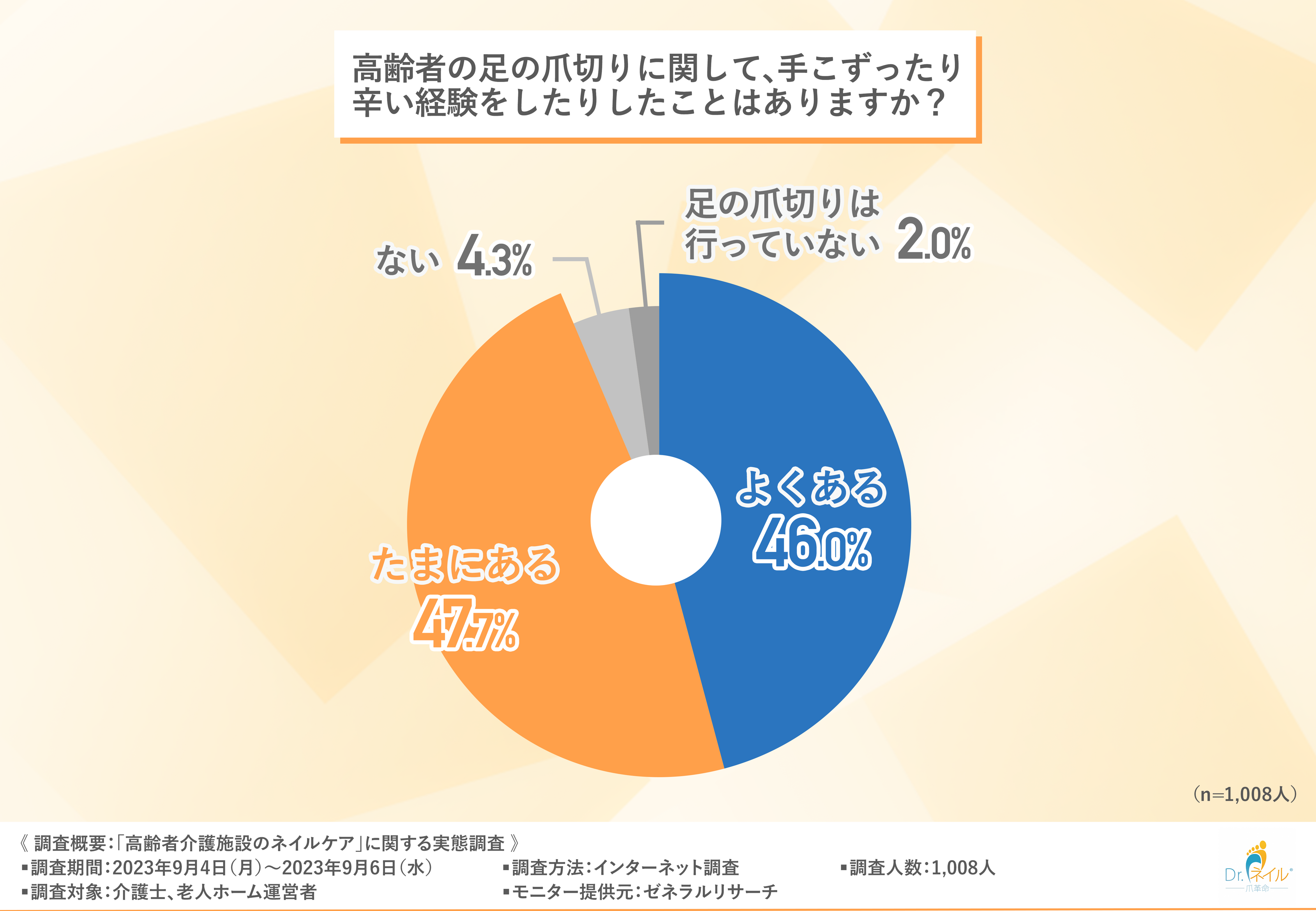 「高齢者の足の爪切りに関して、手こずったり辛い経験をしたりしたことはありますか?」と質問したところ、『たまにある(47.7%)』と回答した方が最も多く、次いで『よくある(46.0%)』『ない(4.3%)』『足の爪切りは行っていない(2.0%)』と続きました。
