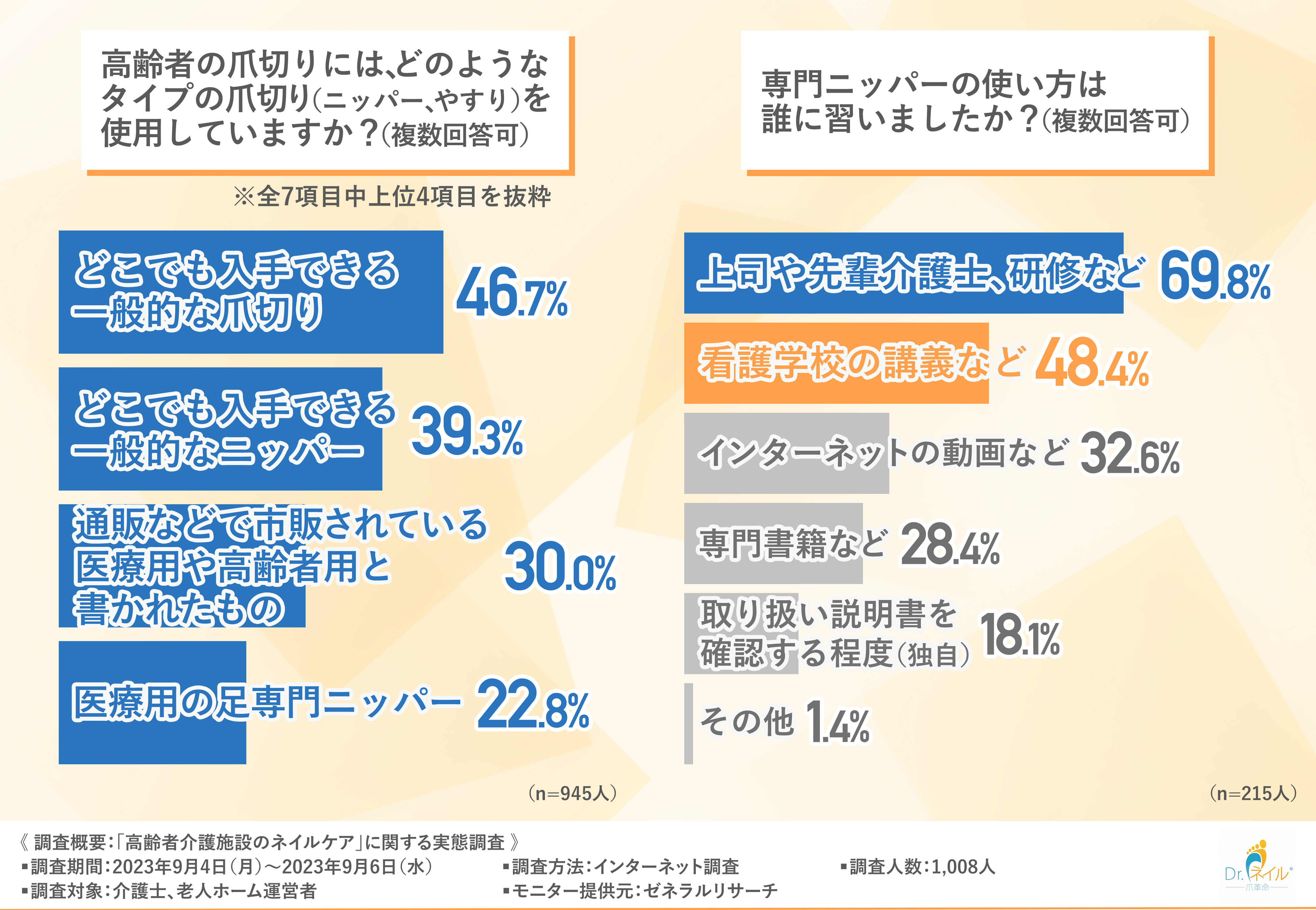 多くの介護施設で、市販されている爪切りやニッパーを使用していることがわかりました。一方、医療用の専門ニッパーを使用している施設は3割に満たないことも明らかになりました。