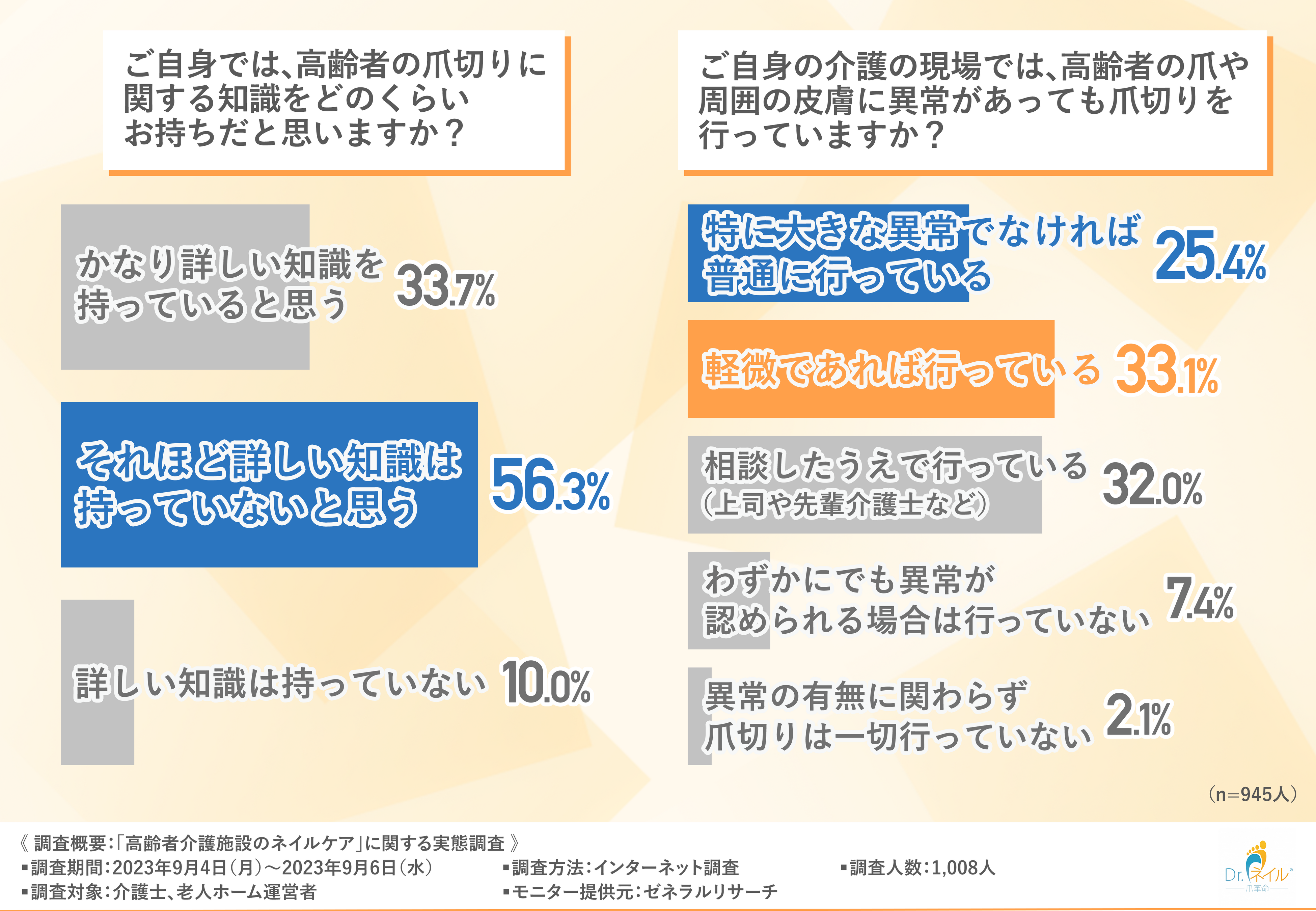ほとんどの介護施設で、軽微であれば爪や皮膚に異常があっても爪切りを行っていることがわかり、爪切りに対する認識が不十分である介護士や経営者がいる可能性が高いことが浮き彫りになっています。