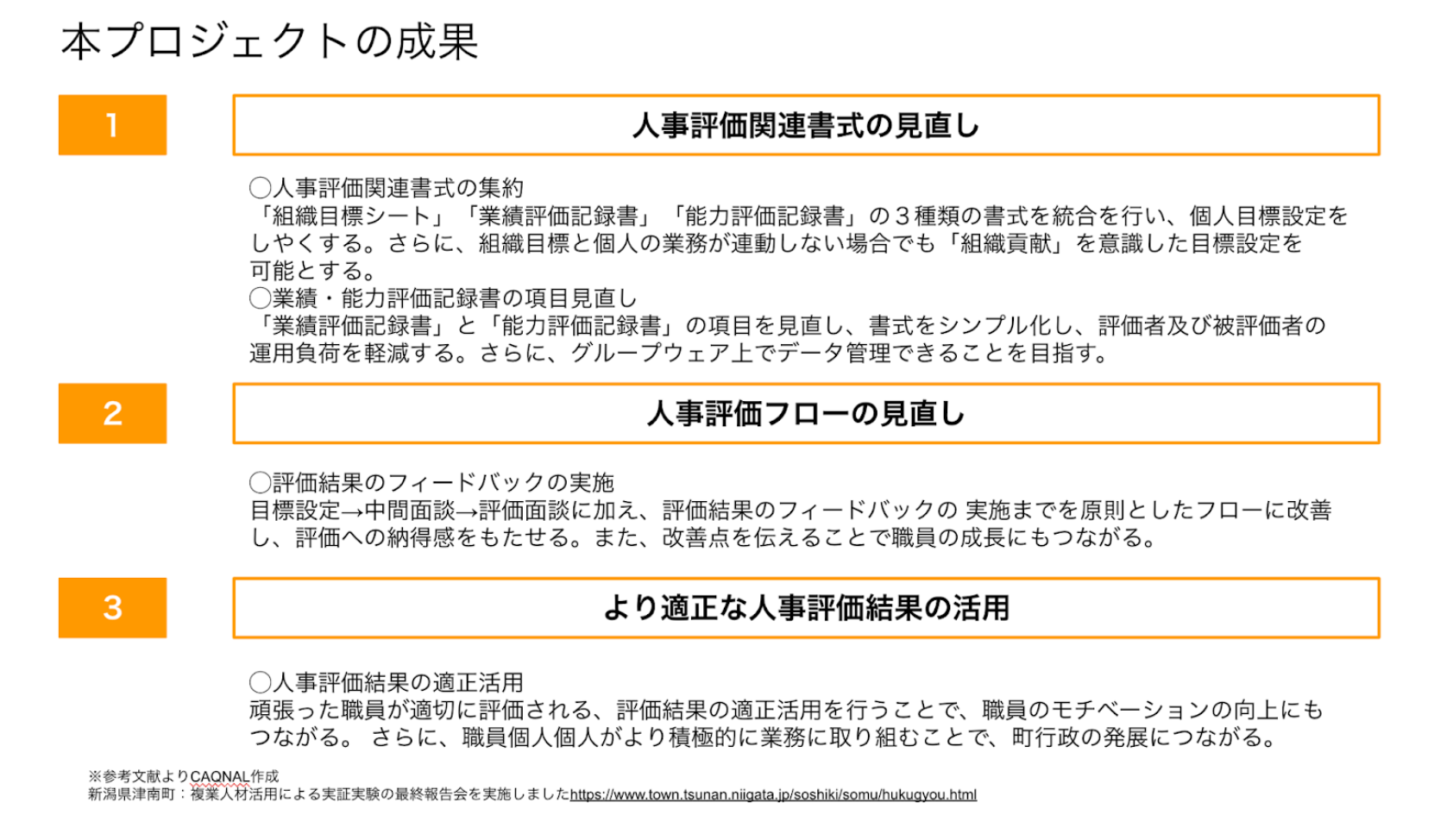 本プロジェクトは、津南町が抱える課題解決のため12回のミーティングに加え、メール等でも都度進捗状況を共有・確認しつつ実施致しました。これまでバラバラに存在していた人事評価関連の書式を統合し、評価項目をシンプルにすることで、評価担当者の人事評価スキルを標準化いたしました。また、職員の個人目標設定を組織貢献を意識した仕様に変更することで効率的かつ効果的な評価ができるようにいたしました。さらに、評価フローを改善し、評価結果のフィードバックを強化することで、適正な評価結果の活用を促進し、職員のモチベーション向上と組織の成長をサポートする仕組みづくりを行いました。