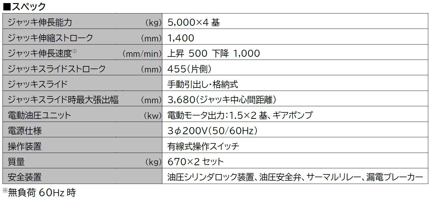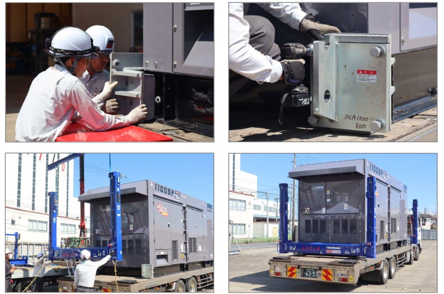今回の「発電機用可搬式ジャッキ装置」は、スペースの限られた現場や低い天井の屋内に、大型発電機を素早く設置できるアクティオオリジナルの製品として開発しました。発電機の4つ角にアタッチメントを取り付け、ジャッキ装置に固定、トラックの荷台より直接アウトリガーを張り出し、油圧ユニットから油圧ホースをジャッキ装置に接続してジャッキの昇降を行なう自揚可能な構造としました。最大で1,100kVAの発電機を降ろすことが可能となります。