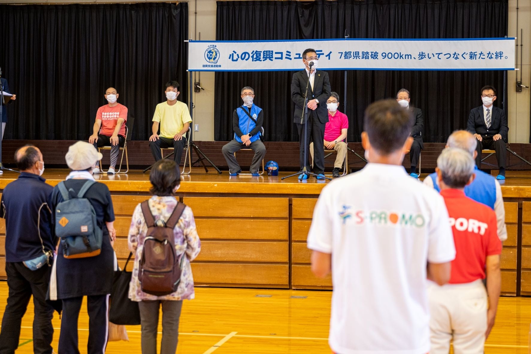 また、青森県ウオーキング協会 会長の中嶋與志久様からは「本日をもって東北復興支援”絆ウォーク”が終了しました。本来ならば昨年の11月で終了するところでしたが、コロナ禍という事情があり延長されまして、最終的に930km、昨年度は福島から八戸、今年は東京から福島まで歩いて終了する予定でしたが、それがままならず最終的に本日をもってゴールとなりました。無事にゴールしていただいた実踏隊の皆様、大変お疲れ様でございました。感謝申し上げます。東京から八戸まで事故もなく無事に終了したことを私からの報告とさせていただきます。」と実踏報告をされました。