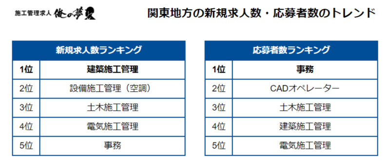 関東地方は、新規求人数では建築施工管理が、応募者数では事務が最も多い結果となりました。