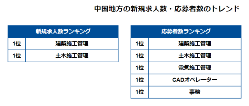 中国地方は、新規求人数では建築と土木の施工管理が同率1位、応募者数では建築・土木・電気の施工管理職に、CADオペレーター・事務を加えた5職種が同率1位となっていました。
