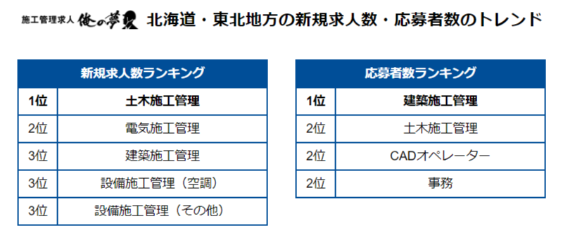 北海道・東北地方は、新規求人数では土木施工管理が、応募者数では建築施工管理が1位となりました。