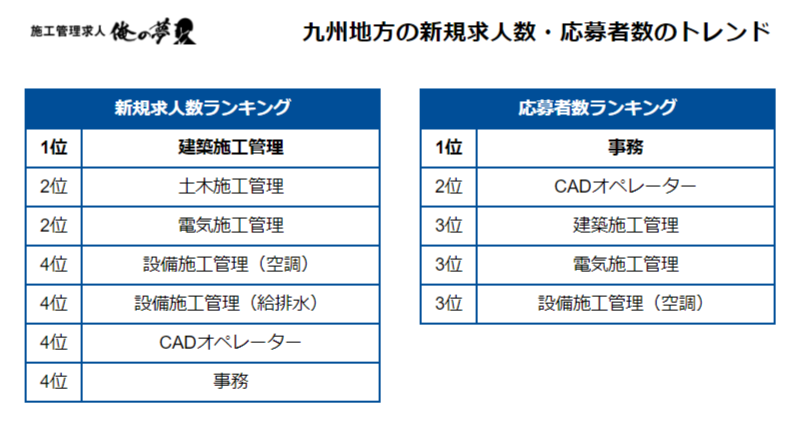 九州地方は、関東や中部と同様、新規求人数では建築施工管理が、応募者数では事務が最も多くなっていました。