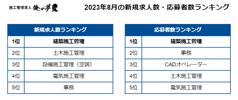 2023年8月は新規求人数、応募者数ともに建築施工管理が最多となりました。
