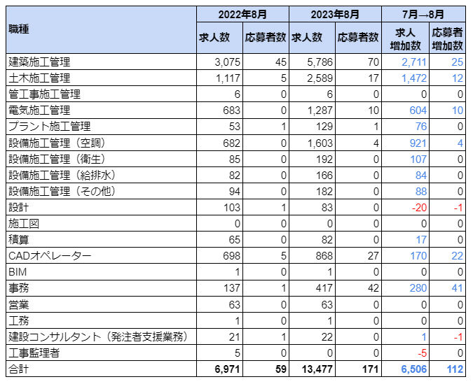 2023年8月は、求人数・応募者数ともに最多である、一番人気の建築施工管理で、応募者数が前月から10%以上アップしました。下記は、全体のサマリーです。