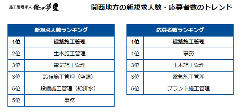 関西地方は、新規求人数・応募者数ともに、建築施工管理が1番人気となっていました。