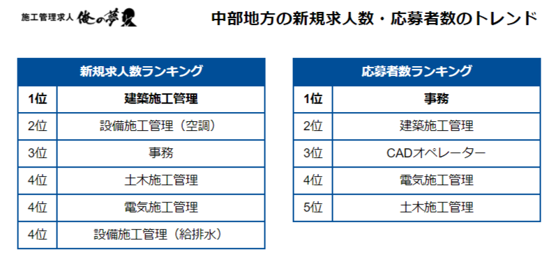 中部地方も、新規求人数では建築施工管理が、応募者数では事務が最も多くなっています。