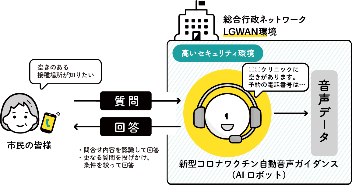 AIロボットにより市民サービスの充実を図るとともに、「新型コロナウイルスワクチン接種コールセンター」の負荷を軽減させます。