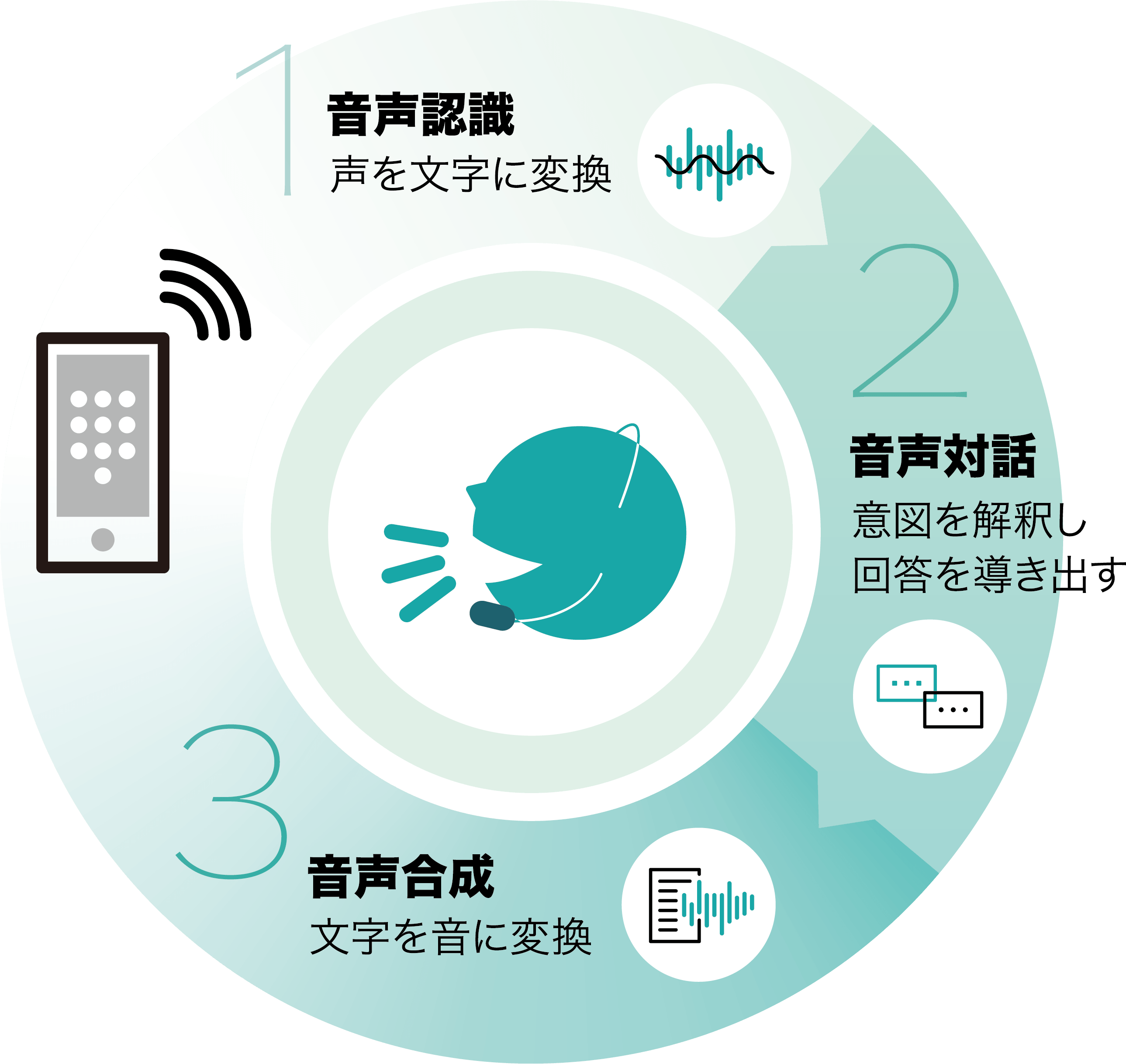 AIロボットは音声認識技術、音声対話技術、音声合成技術を用いて、電話上のコミュニケーションを自動化します。あらかじめ、学習したデータやシナリオに沿って、お問合せへの回答を行うことができます。