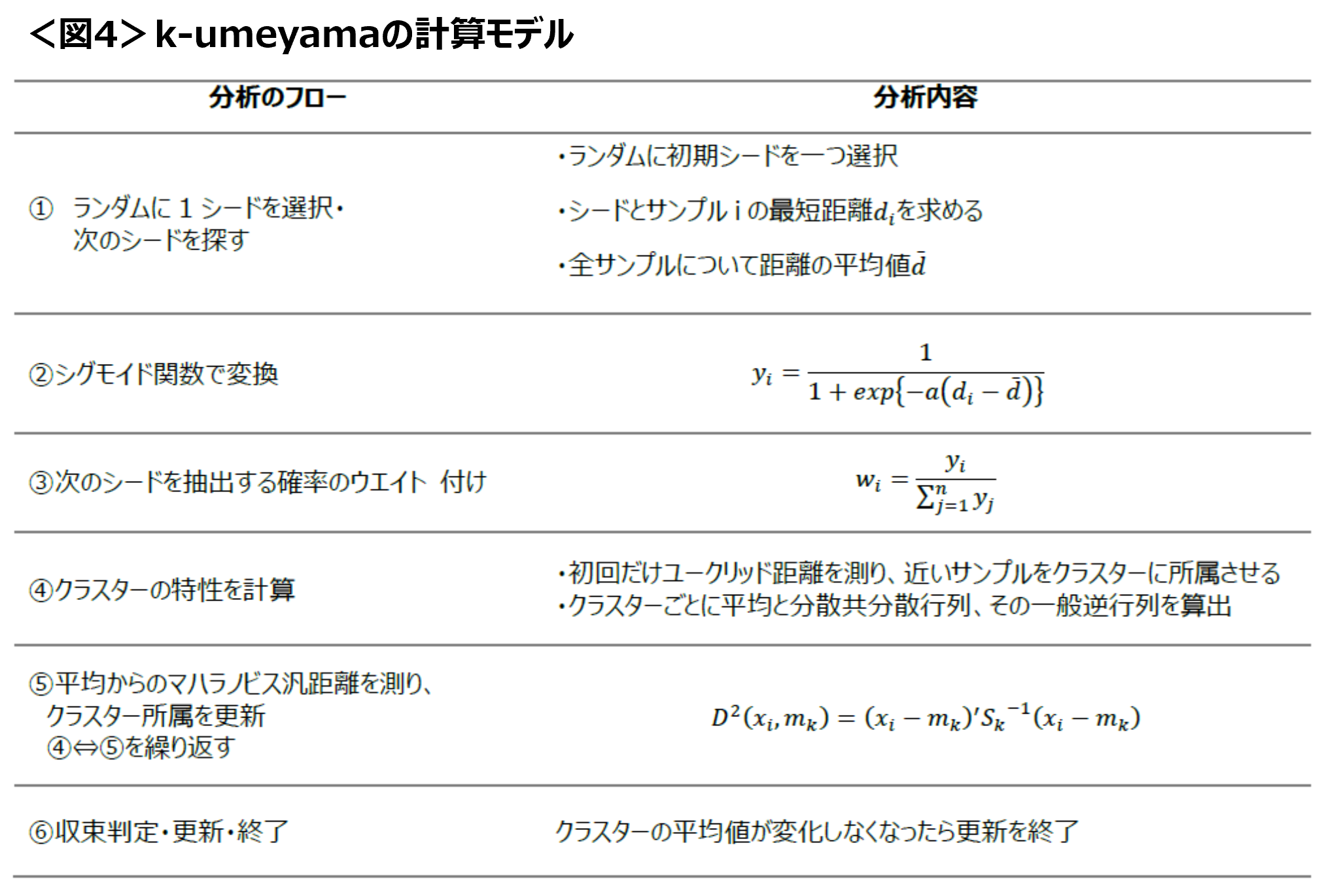 ランダムに一つずつ初期シードを選びそのシードと最短距離のdiを選び、すべてのデータポイントを計測。その平均距離をだした値をシグモイド関数で変換して、次シードを抽出するためのデータポイントのウエイト付けをします。その後、初回だけユークリッド距離で測り、サンプルをクラスターに所属させます。その後は、クラスター毎に平均と分散共分散、その一般逆行列を算出して、次にマハラノビス汎距離を測って所属クラスターの更新を繰り返します。クラスターの平均値が変化しなくなったら、終了です。<図4>