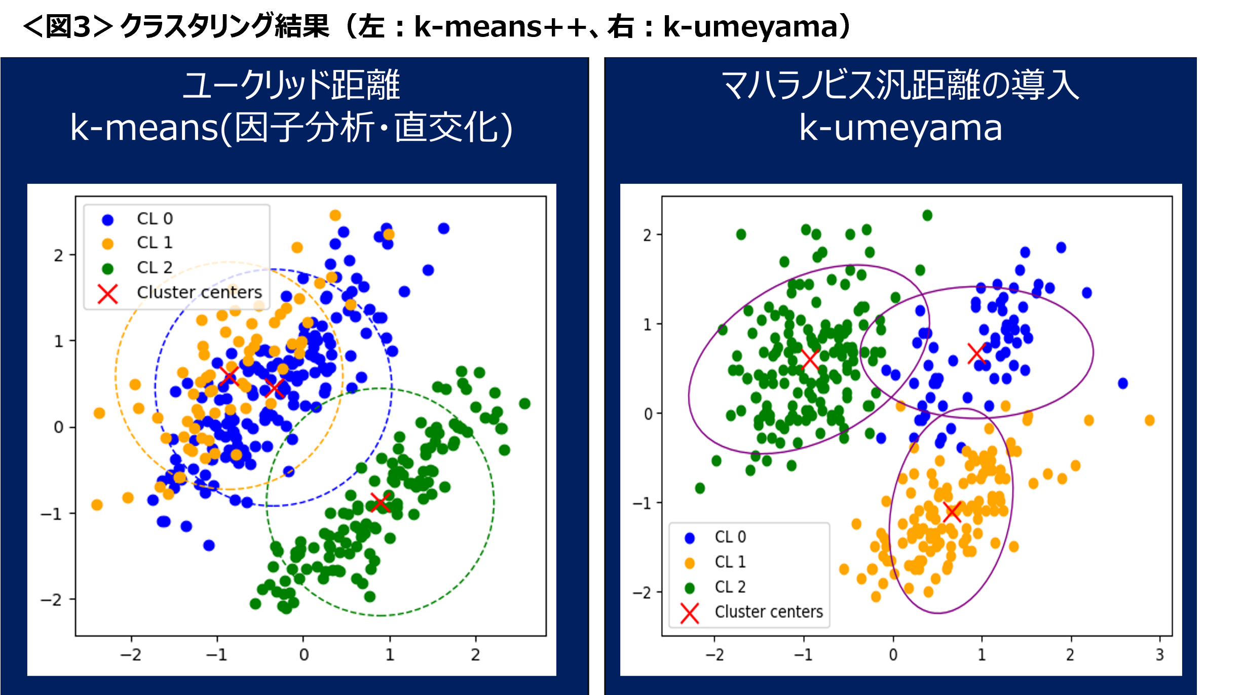 クラスター分析は、似た特徴を持つもの同士をグループにまとめる手法で、特にマーケティング・リサーチの業界でよく用いられます。一般的な手法、k-meansでは、最初にデータを「因子分析・直交化」という方法で整理します。これは、いろいろな情報を簡潔に表すためのステップですが、実は弱点があります。因子分析・直交化はデータの中の関連性を取り除く手法ですが、すべての集団が完璧に相関性を取り除いて整理されているわけではありません。また、因子分析・直交化をおこなうと、データ全体を表現する量が減少することもあります。グラフを用いて、因子分析・直交化したk-meansとマハラノビス汎距離を導入したk-umeyamaのクラスター分析の結果を比較したところ、その差異は一目瞭然となりました。グラフの左側は、因子分析による直交化を施したデータをk-meansでクラスタリングした結果です。こちらは、クラスター0と1が近接し、重なり合う正円の形をしていて、異なる集団がうまく分けられていないことを意味します。一方で、右側のグラフはマハラノビス汎距離を採用したk-umeyamaのクラスタリング結果です。こちらは、3つのクラスターが楕円の形状をとりながら、明確に区別されており、それぞれの集団の特性や違いをより精確に捉えることが確認できます。マハラノビス汎距離を導入することで、明らかにクラスタリングの精度と有用性が大きく向上することがわかります。<図3>
