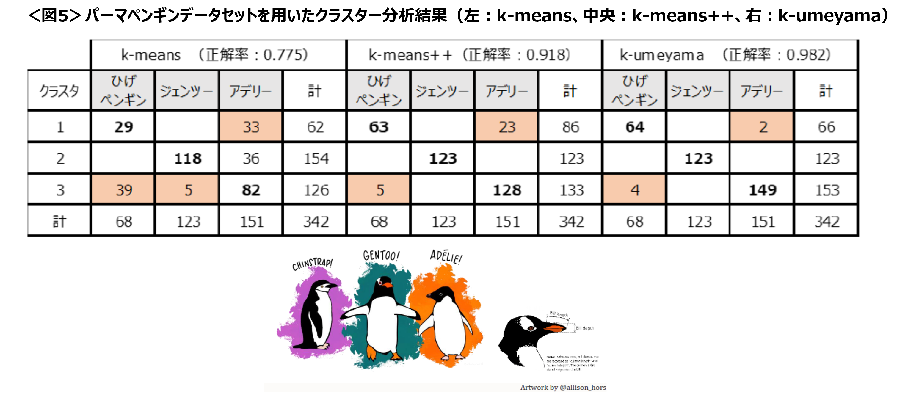 クラスタリングの精度確認のため、パーマペンギンデータセットを用いて、ペンギンの成鳥の4種類のサイズから「ヒゲペンギン」、「ジェンツーペンギン」、「アデリーペンギン」の3群の正解のあるデータを、k-meansとk-means++、k-umeyamaでクラスター分析を行い比較しました。