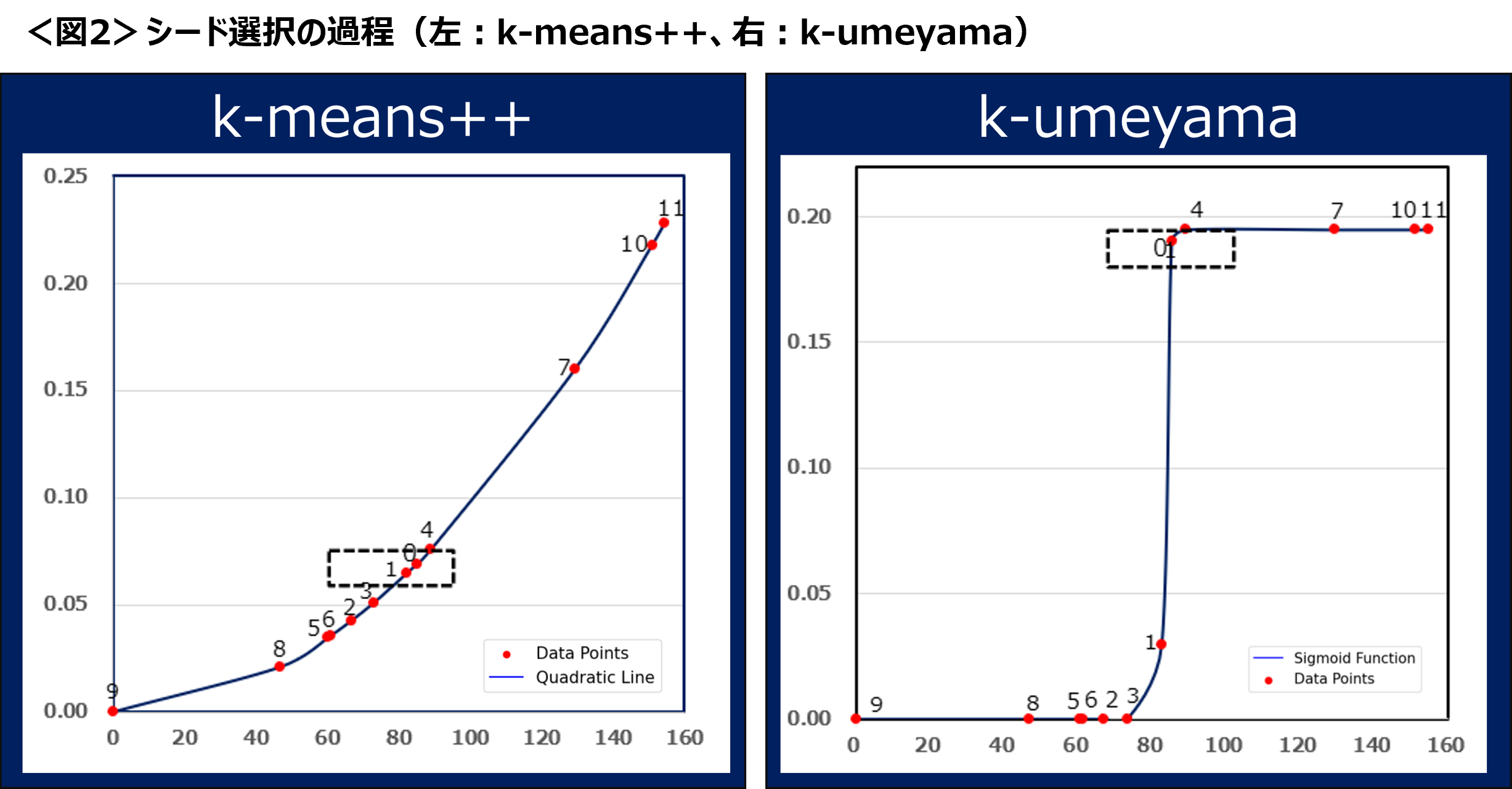 これらの問題点を解決するための新しいアプローチとして、k-means++が開発されました。この方法では、初期シードを順番に選び出し、前のシードから距離が遠い次のシードを確率的に選択することで、クラスターが均等に分布するように配置されます。この改良により、クラスタリングの質と再現性が向上しました。中央がk-means++、右側がk-umeyamaとなり、それぞれシードの位置は違いますが。1回目と2回目のシードの位置は安定しています。しかし、k-means++は、シードの選択過程で、最も遠い点の外れ値が選ばれやすくなるという弱点があります。<図1>