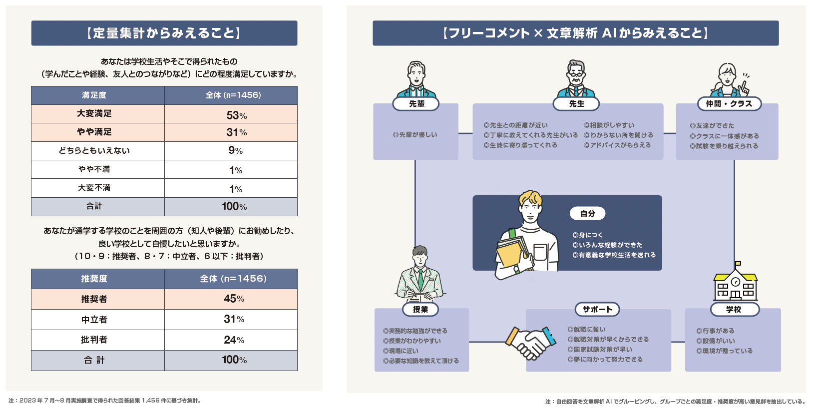 結果として、定量設問からは、非常に高い満足度であることが確認され、そのことが他者への推奨意向(「自分の学校を自慢したい」「後輩に勧めたい」という気持ち)をもたらすことが分かりました。