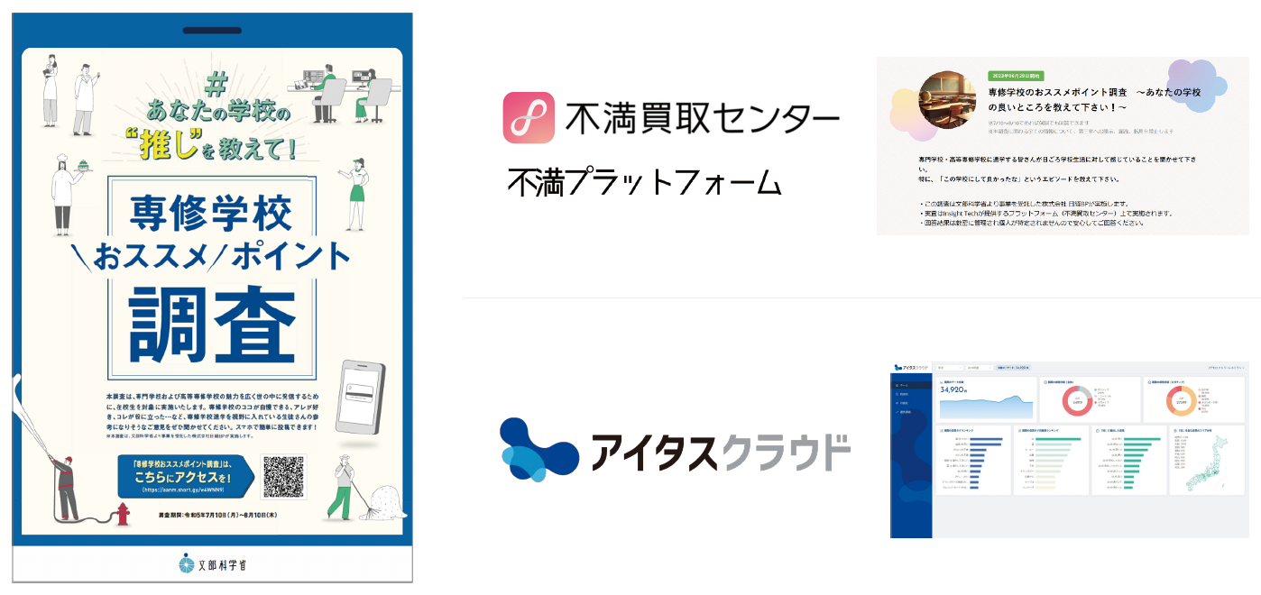 本取り組みでは、Insight Techが保有する特許取得済みの声収集プラットフォーム「不満買取センター」の仕組みである「不満プラットフォーム」を活用し、専修学校に通う在校生の皆さんの本音・おススメポイントを収集しました。そこで得られた在校生の“本音”のテキストデータをInsight Techが提供する文章解析AIダッシュボード「アイタスクラウド」で解析し、専修学校のおススメポイントを総括しました。