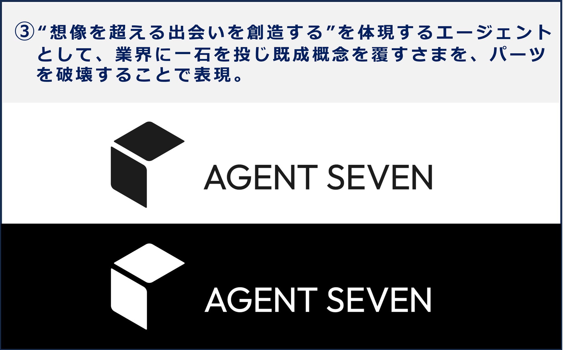 ③そこからさらに、“想像を超える出会いを創造する”を体現するエージェントとして、業界に一石を投じるような新たなサービスの創出を通じて人材紹介の既成概念を壊し、新しい「アタリマエ」をつくっていくさまを体現していきたく、立方体の一部パーツ(=人材業界・転職市場)を取り除いた形での、ロゴの再構築を行いました。