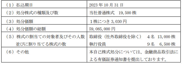 本自己株式処分における払込価額につきましては、恣意性を排除した価額とするため、2023年9月27日(取締役会決議日の前営業日)の東京証券取引所プライム市場における当社の普通株式 の終値である3,030円としております。これは、取締役会決議日直前の市場株価であり、合理的かつ特に有利な価額には該当しないものと考えております。