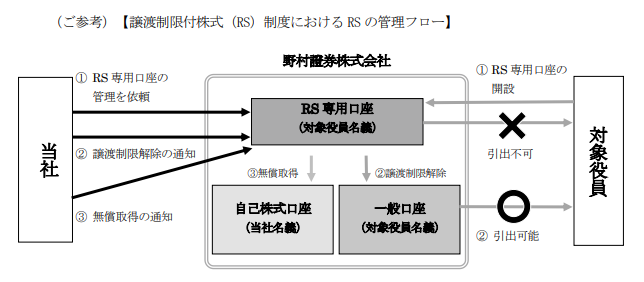 本株式は、譲渡制限期間中の譲渡、担保権の設定その他の処分をすることができないよう、譲渡制限期間中は、対象役員が野村證券株式会社に開設した専用口座で管理される。当社及び対象役員は、本株式に係る譲渡制限等の実効性を確保するために、各対象役員が保有する本株式の口座の管理に関連して野村證券株式会社との間において契約を締結している。