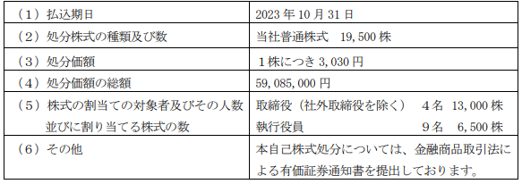 本自己株式処分における払込価額につきましては、恣意性を排除した価額とするため、2023年9月27日(取締役会決議日の前営業日)の東京証券取引所プライム市場における当社の普通株式 の終値である3,030円としております。これは、取締役会決議日直前の市場株価であり、合理的かつ特に有利な価額には該当しないものと考えております。