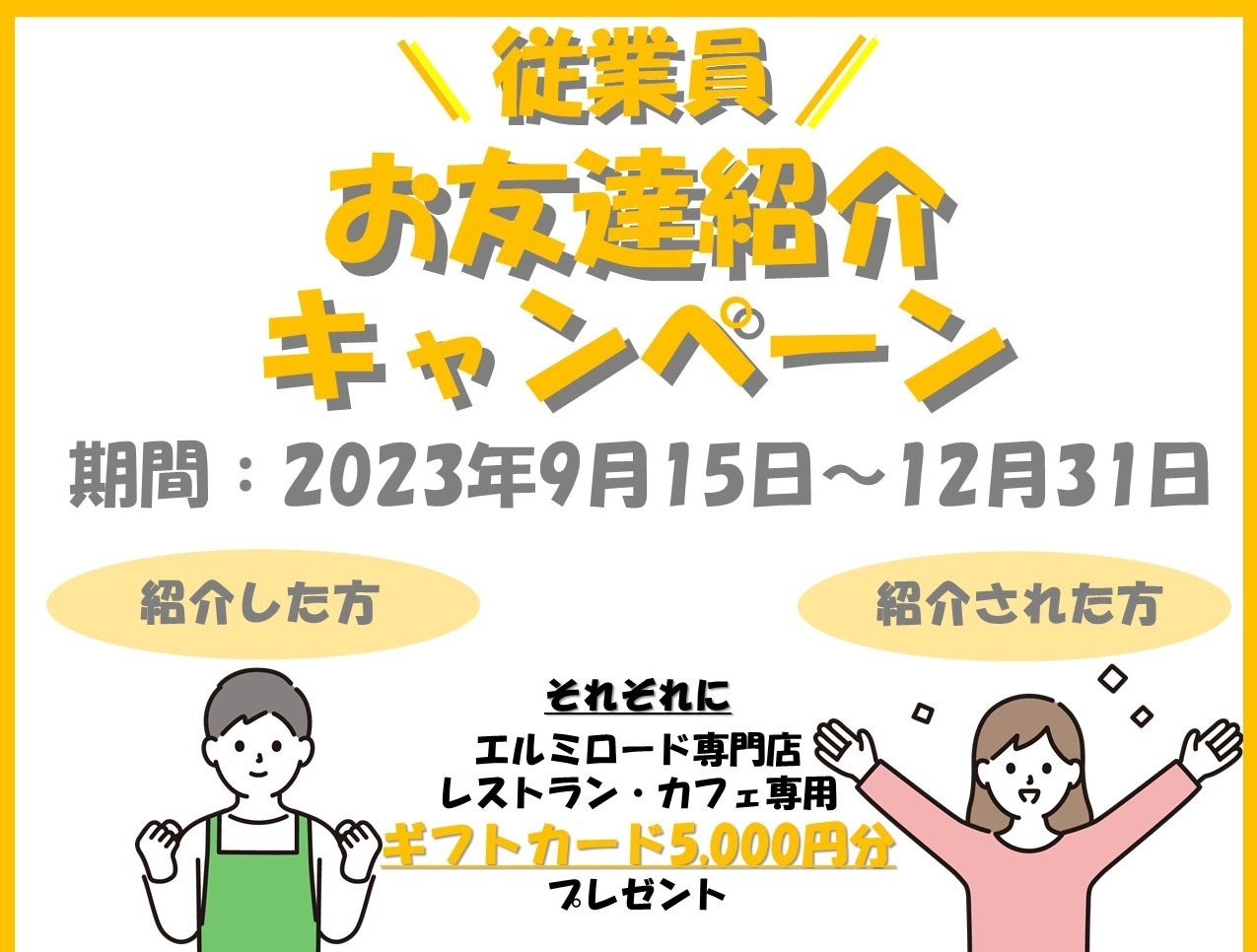 店舗でのスタッフ採用活動を応援するため、新百合ヶ丘エルミロードでは、「お友だち紹介キャンペーン」を実施しています。期間中に、新百合ヶ丘エルミロードに勤務するショップスタッフが、知人・友人を紹介していただくと、採用された際に、紹介した方・紹介された方の両名に、新百合ヶ丘エルミロードのレストラン&カフェで使えるギフトカードをプレゼントします。