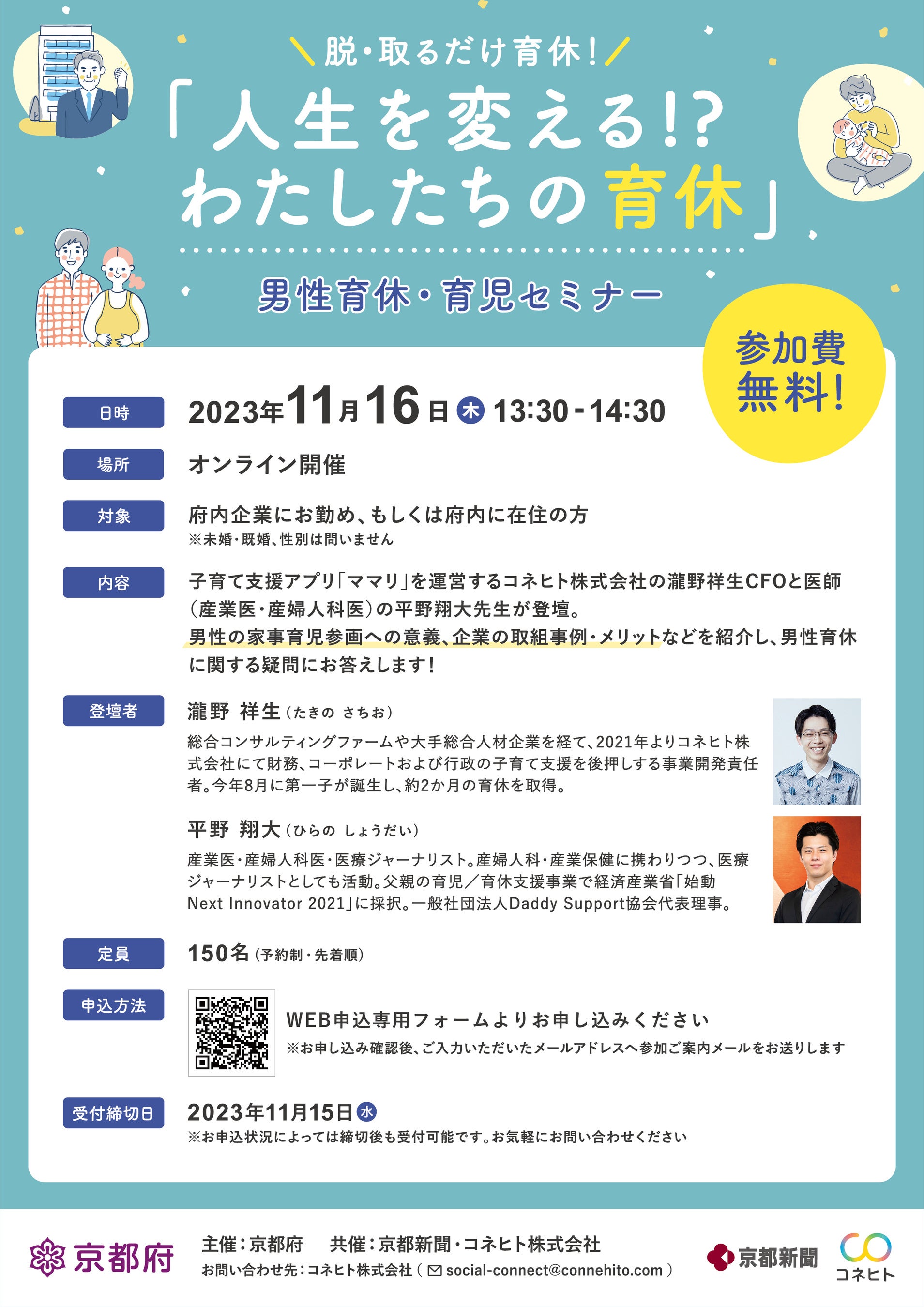 【方 法】京都府HP「令和5年度男性育休促進事業について」から申込み