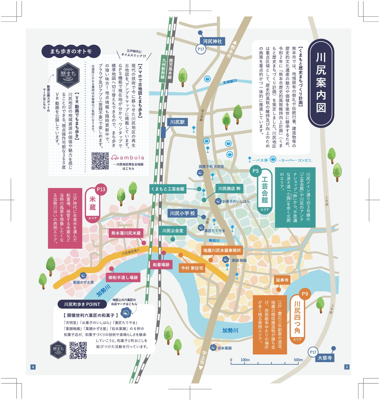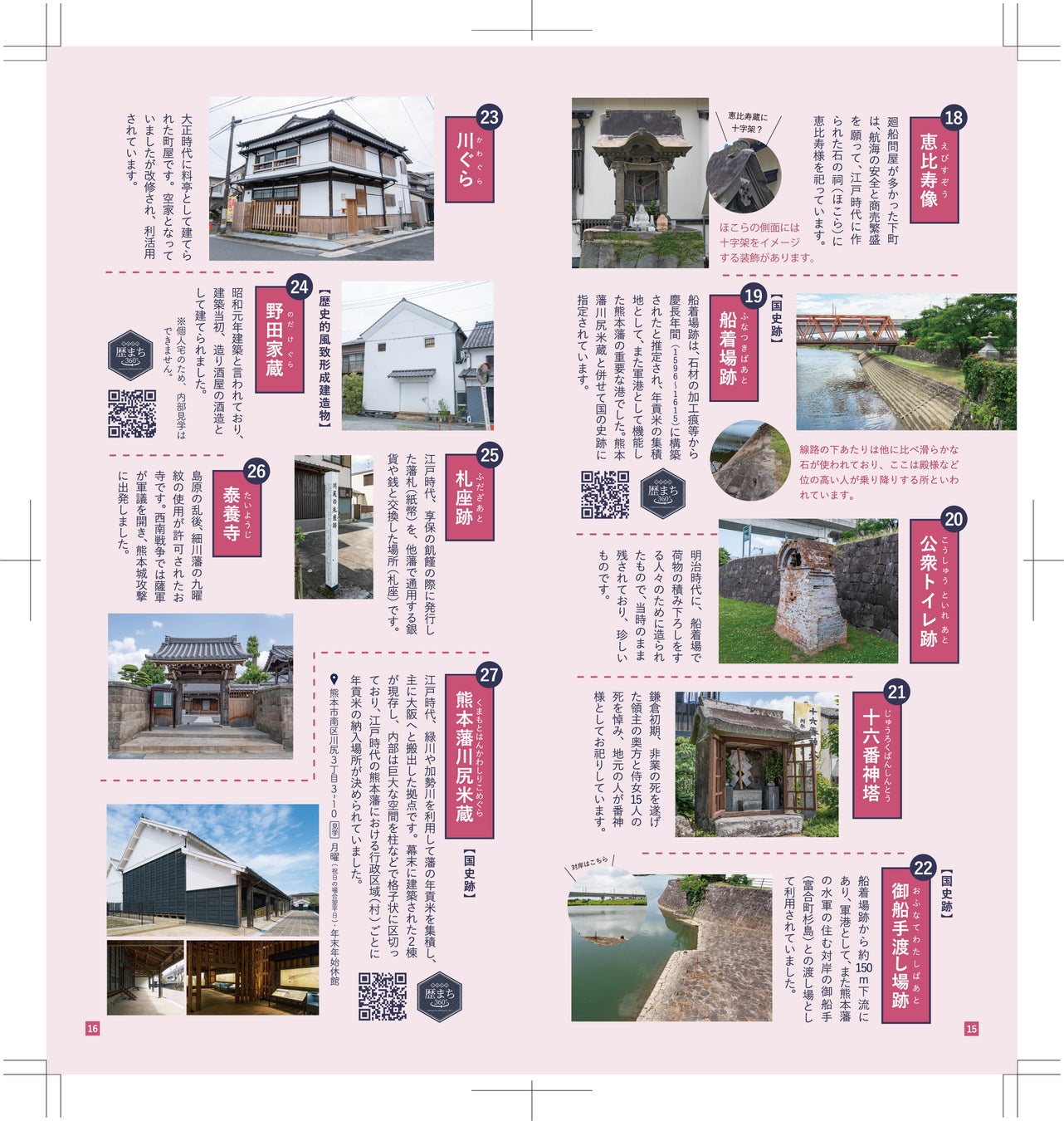 川尻地区の見所を3つのエリアに分け、エリア毎の地図とスポットを掲載しており、まち歩きに便利なサイズです。歴史的建造物をはじめ、まち歩き案内人おすすめのスポットも多数掲載しています。