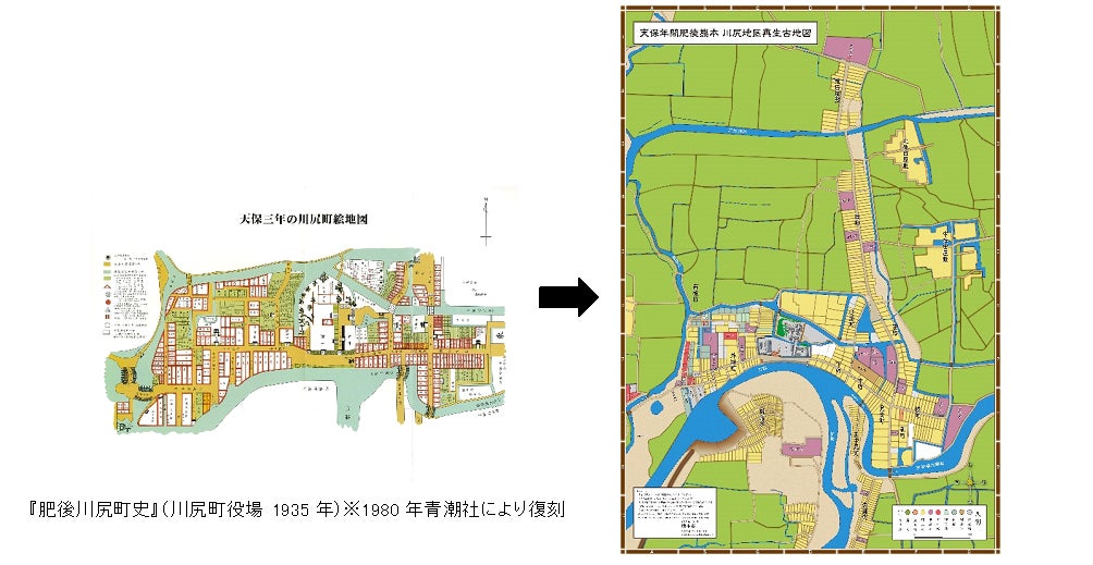 天保3年の川尻町絵地図や各種史料を元に、緯度経度や文字を調整した再生古地図を制作し、イラストマップをスマホやPC上で見られるambula mapに掲載しました(https://web.ambula.jp/ambula_web/dist/?ui=F13QU8LD&mi=565&h=true&bd=true&bg=true&in=true&openExternalBrowser=1)。