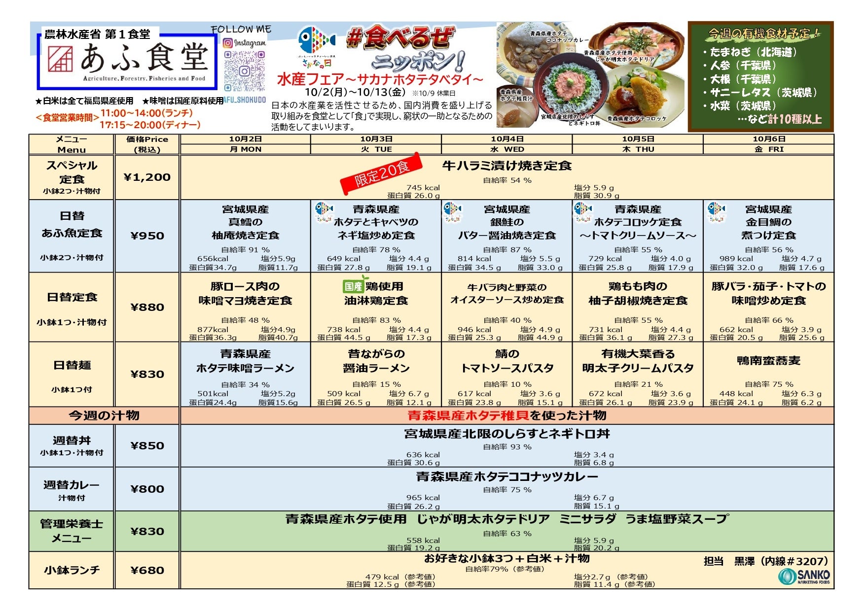 そんな想いの中、当社受託食堂では10月2日~10月13日の間、『食べるぜニッポン!水産フェア~サカナホタテタベタイ~』イベントを開催致します。そのイベントの中で、あふ食堂ではイベント期間中、青森県産ホタテを使用した商品を提供致します。どの商品も青森県産ホタテの美味しさが味わえる商品です。