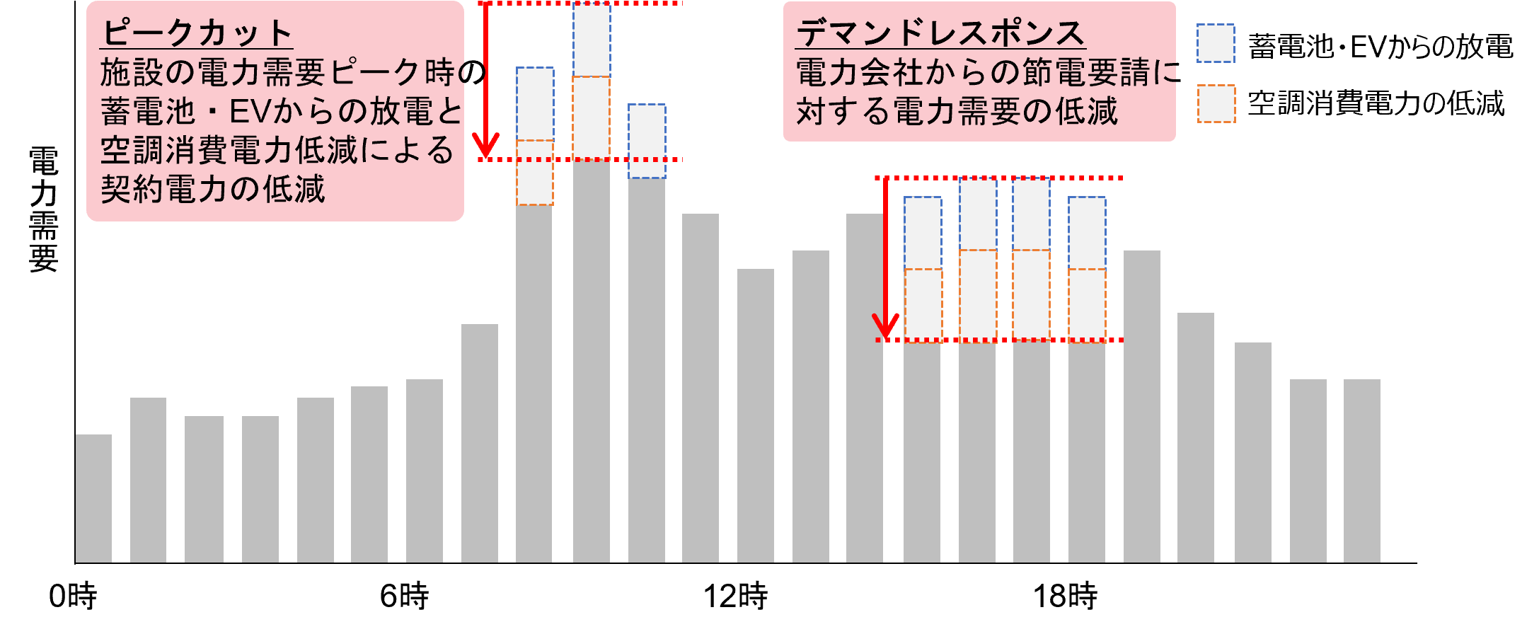 蓄電池・EVの放電と空調消費電力低減によるピークカット、デマンドレスポンスのイメージ