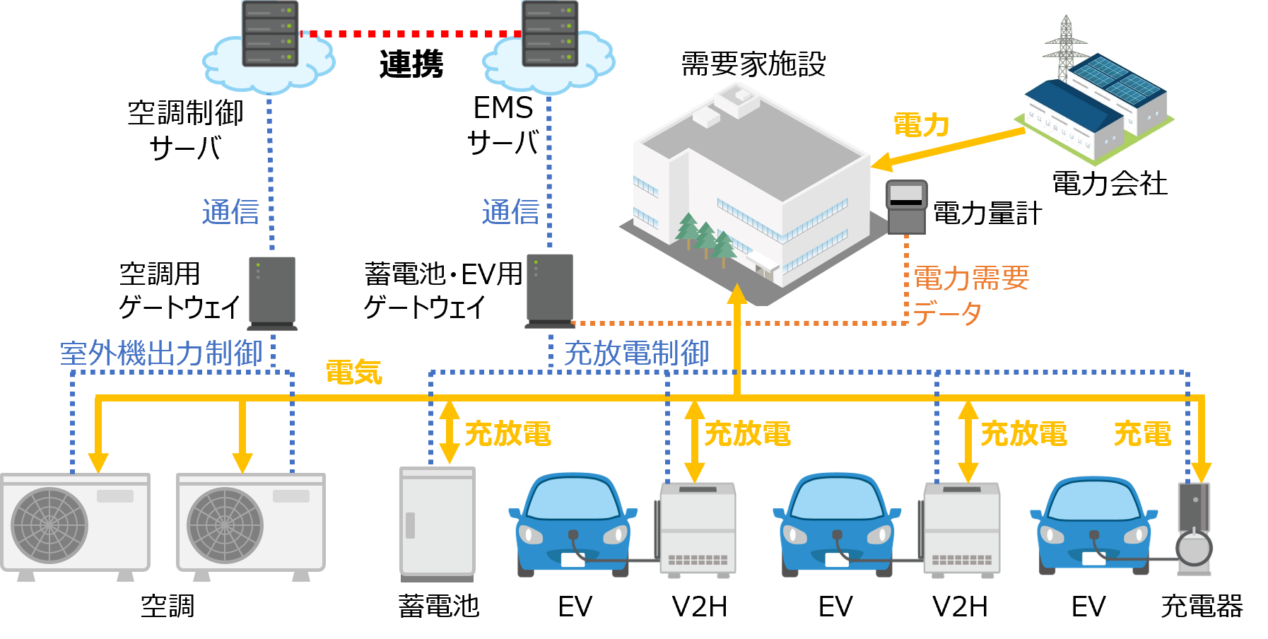 本実証実験では、2021年10月に当社、国富町、BIPROGY株式会社※、株式会社スマートドライブが発表した「宮崎県国富町役場でのエネルギーマネジメント実証実験の開始について」で開発したエネルギーマネジメントシステムで制御対象としていた蓄電池・EVに、新たに空調制御システムを追加して連携制御を行います。