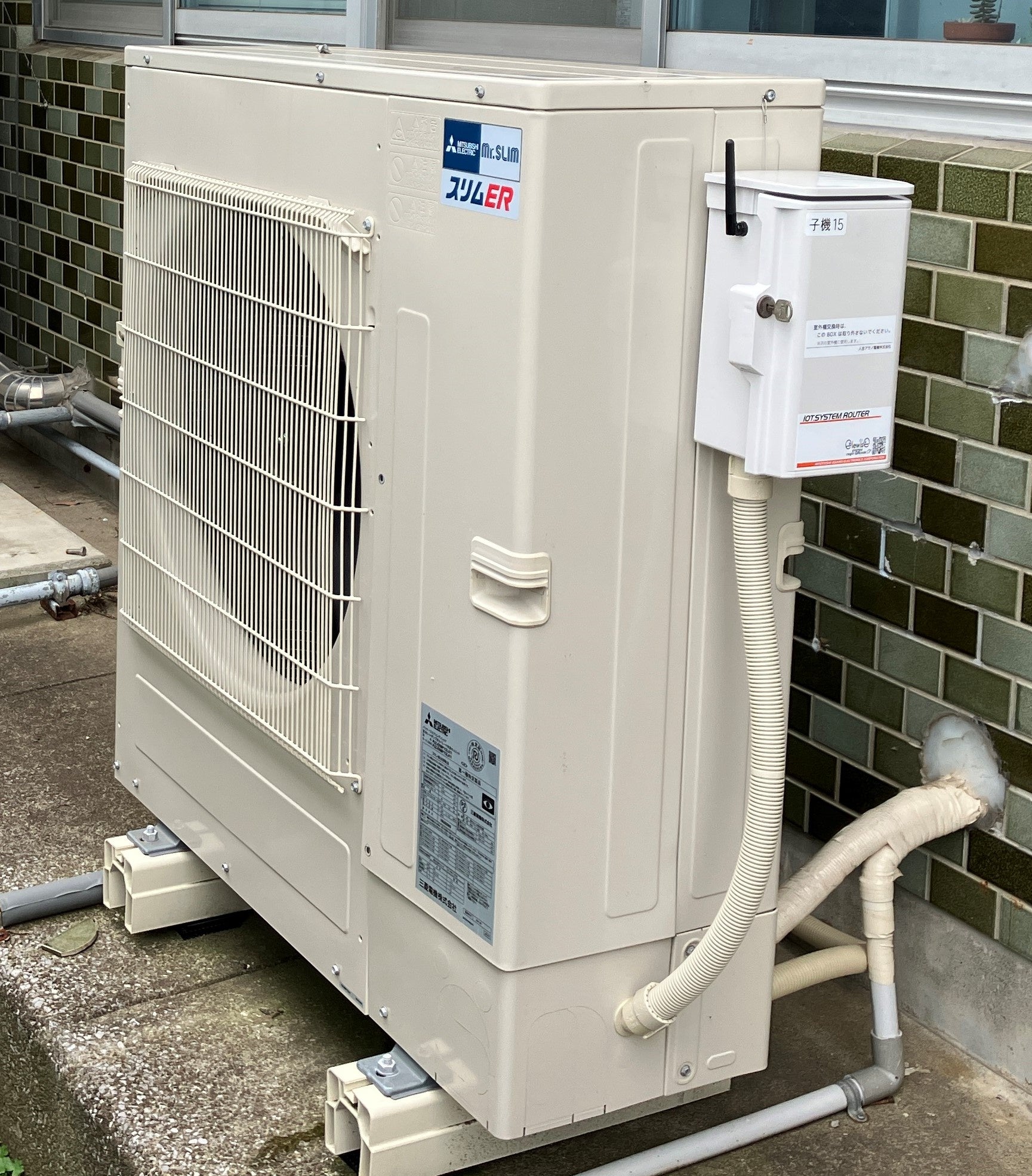 (左)空調制御機器を取り付けた空調室外機(右)蓄電池・EVの充放電と空調の連携制御のイメージ