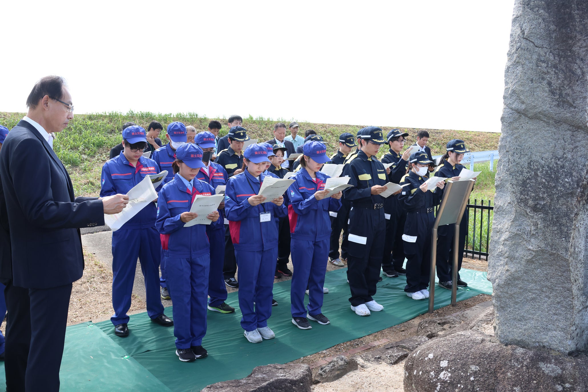 今年も9月29日、濱田高槻市長のほか谷川知実近畿地方整備局淀川河川事務所長をはじめ、同市ならびに淀川河川事務所職員約25人が同市大塚町の淀川堤防にある洪水記念碑前に集まり伝承式を行いました。式では、「淀川水流千古 變災來自有時 世人能思天意 居安必勿忘危(淀川の水は永遠に流れ続け、災害となって降りかかってくるときもある。人はそれも自然の摂理と受け止め、安楽に暮らしていても、絶対に危機のあることを忘れてはいけない)」などと漢文で刻まれた洪水記念碑の要約文を、参加した職員全員で読み上げ。その後、同市職員代表が「我々は、「大塚切れ」を決して忘れることなく、心に刻み込み、大塚切れからの復旧やその後の水防対策に取り組まれた先人たちの並々ならぬご労苦に感謝するとともに、この大塚切れを後世に伝え、市民の安全・安心を守り続けて行くことを、改めてここに誓います」などと決意を述べました。参加者は、大塚切れの教訓を風化させることなく、水害から市民の生命・財産を守り続ける決意を再確認しました。