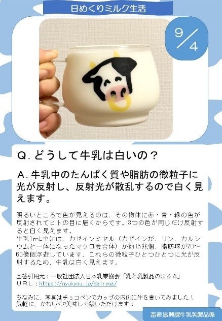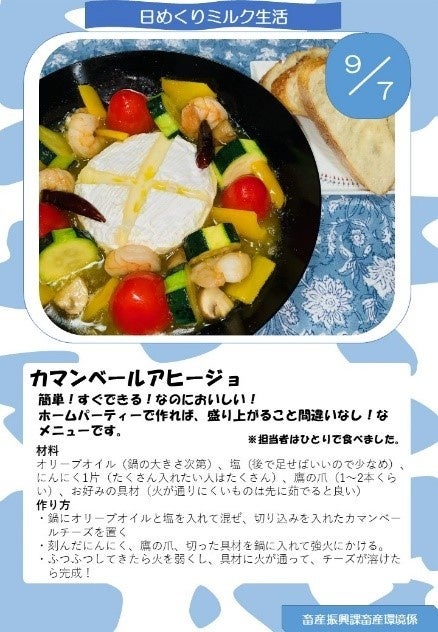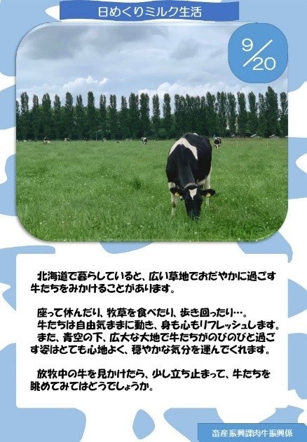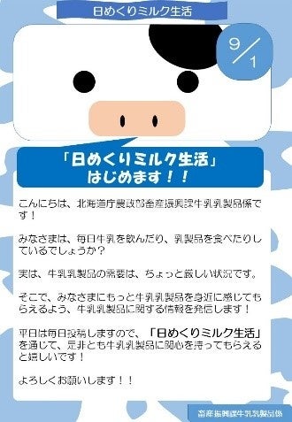 8月の牛乳乳製品の値上げを受け、さらに牛乳乳製品の消費の落ち込みが懸念されていることから、酪農への理解醸成と牛乳乳製品の消費拡大に向けて、北海道職員が牛乳乳製品を使用した料理や酪農風景、牛乳乳製品や酪農に関するマメ知識などの情報を北海道公式SNSを通じて9月1日から毎日(閉庁日を除く)発信しています。