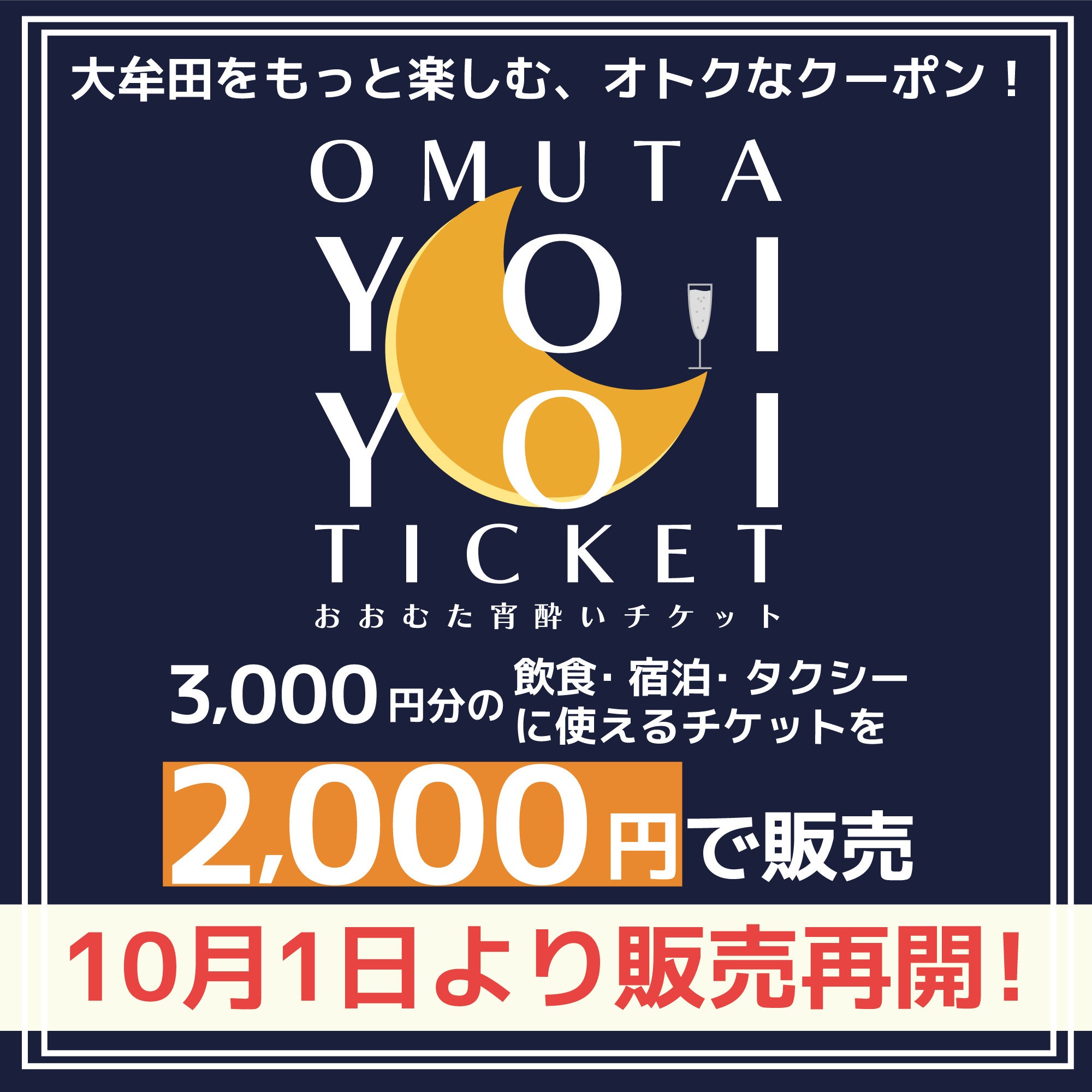 9月1日より販売しておりましたプレミアム付きチケット「おおむた宵酔いチケット」について、早期に完売となっておりましたが、10月7日(日)開催のツール・ド・九州 福岡ステージフィニッシュイベントのほか、11月・1月開催の「光の航路」など、市内で開催される様々なイベントに訪れる方に、大牟田市内での飲食や宿泊などをお楽しみいただくため、10月1日より追加販売します。