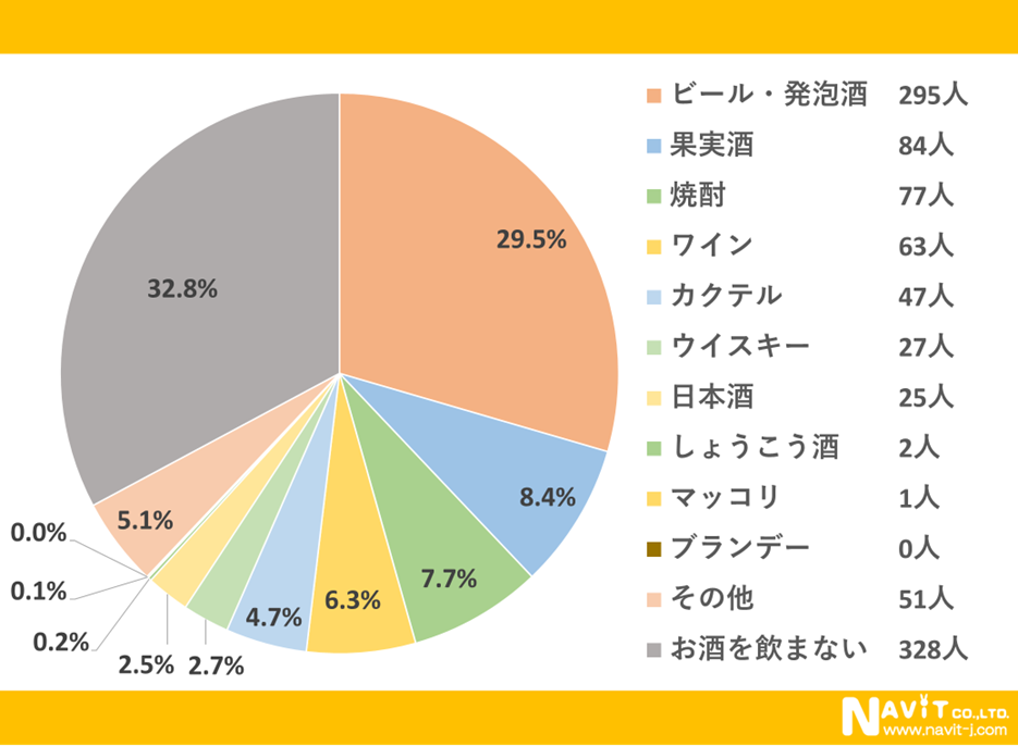 普段飲むお酒の種類としては「ビール・発泡酒」という方が1番多く29.5%となっています。次に「果実酒」が8.4%で「焼酎」が7.7%と続いています。