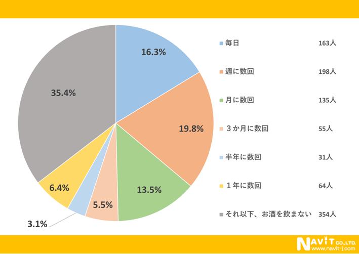 どのくらいの頻度でお酒を飲みますかという質問に対して「週に数回」という方が1番多く19.8%になっています。次が「毎日」という方で16.3%です。「月に数回」という方が13.5%と続いています。
