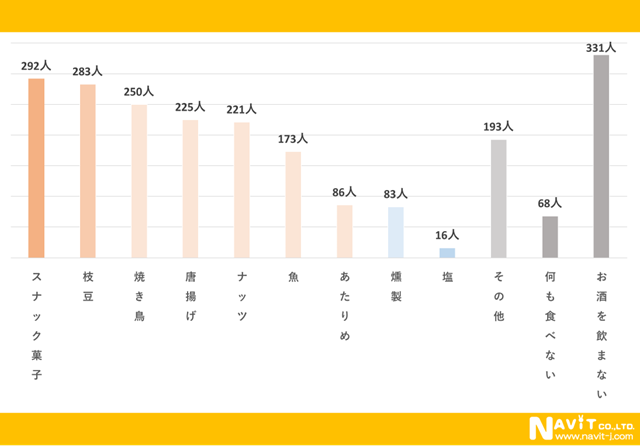 この質問は複数回答です。おつまみで1番人気は「スナック菓子」で292名となっています。おそらく家飲み需要のおつまみでしょうね。2番目と3番目は僅差です。「枝豆」が283名、「焼き鳥」が250名となっています。どちらも居酒屋の定番メニューです。