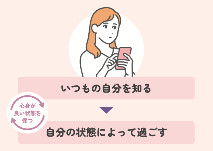 自身の心と体の状態を記録し、自分の今の状態を把握し、状態にあったセルフケアができるようサポートすることで、不調の改善を促します。