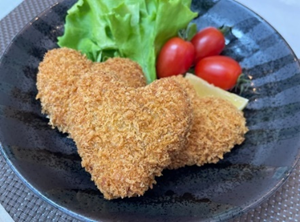 生卵と生パン粉をつけて、ヘルシーベジオイルで揚げるので、サクサクっとおいしく、胃にも優しいメンチカツ。