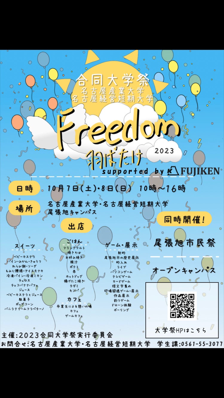 なお、名古屋産業大学大学祭は名古屋経営短期大学と合同で開催され、今年度の大学祭テーマは「Freedom!! ~羽ばたけ~ supported by FUJIKEN」を掲げています。