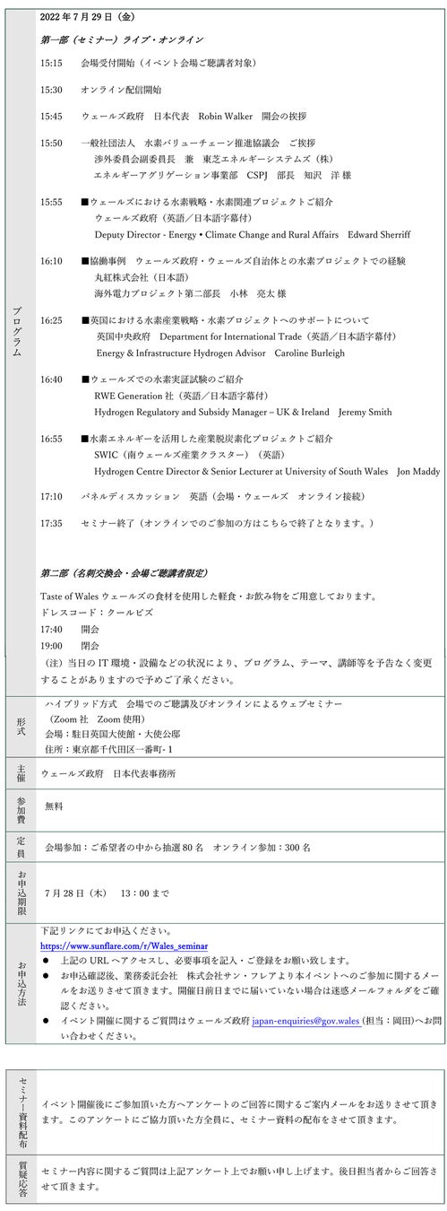 本イベントでは、駐日英国大使館・大使公邸を会場とした現地での聴講と、Zoomライブ配信によるオンライン視聴のハイブリットでおこないます。是非この機会に英国ウェールズによる水素を活用した脱炭素プロジェクトにおけるビジネスウェブセミナーに参加登録のうえ、ご視聴ください。