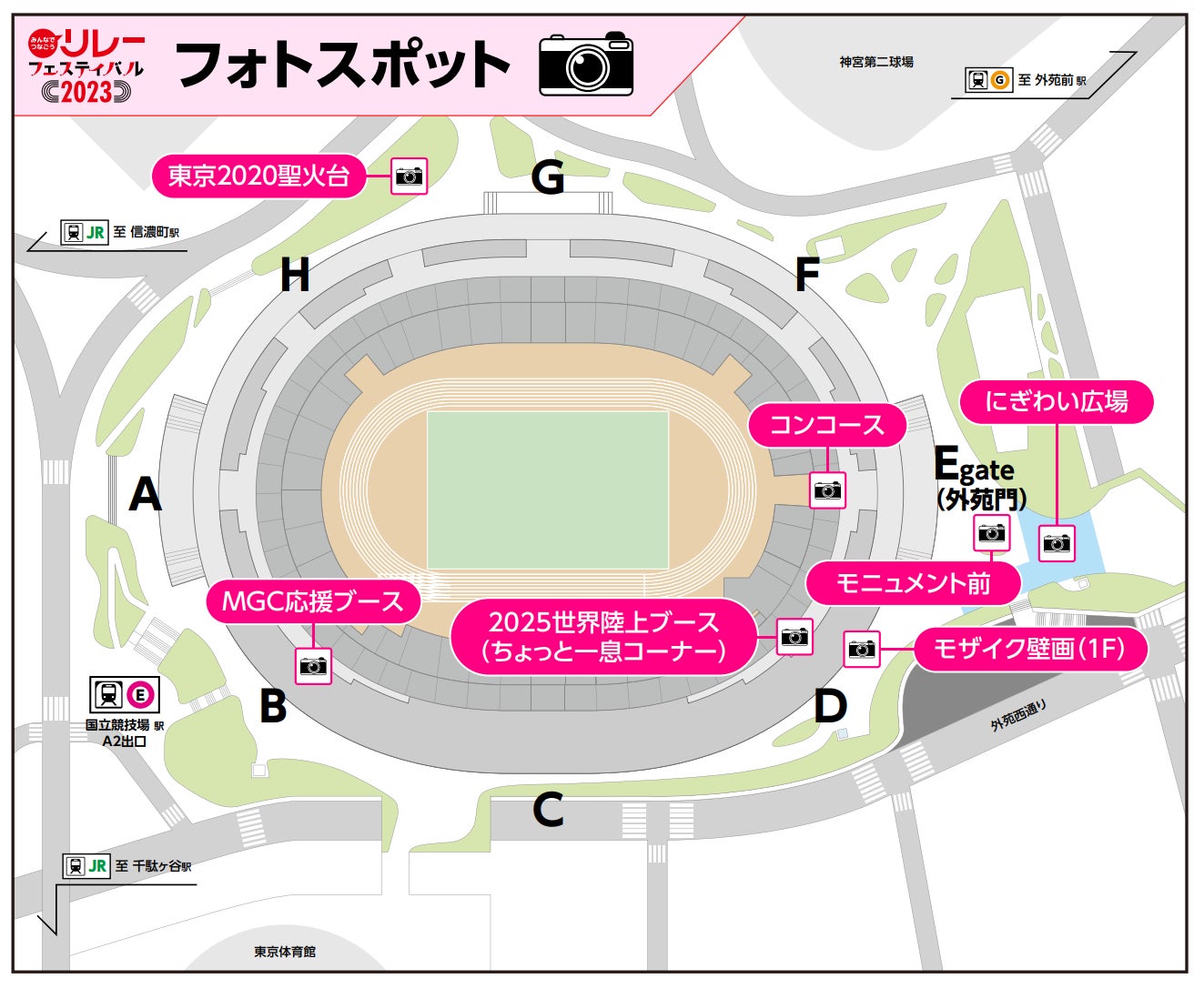国立競技場の広いトラックと共に、撮影できるスポットは1階コンコースGATE3の上部に設置しています!リレーのフィニッシュ後に4人揃っての1枚や応援してくれた仲間と一緒に記念撮影はいかがですか!?