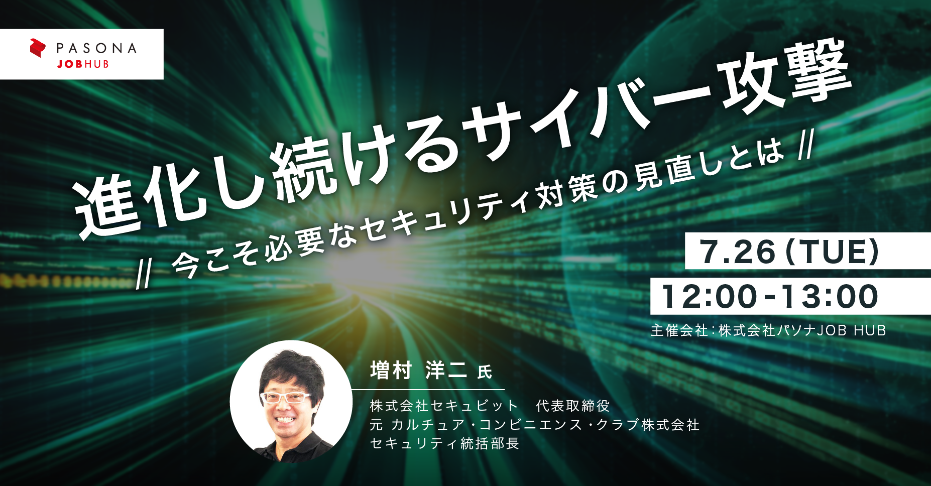 そこでこの度パソナJOB HUBが開催するオンラインセミナーでは、カルチュア・コンビニエンス・ クラブ株式会社をはじめ、大手企業にてセキュリティ部門の責任者を務め、現在は業種・業態問わず幅広い企業のセキュリティ支援を行う増村洋二氏が登壇。進化し続けるサイバー攻撃に耐えうるセキュリティ対策のポイントついて、分かりやすく解説いたします。